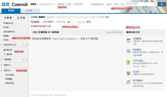 页面整齐简洁,采用一体化的侧边栏设计让邮箱导航更加清晰分为邮箱管理主功能区、通讯录区、其他文件夹、其他邮箱和增值功能服务区。页面管理和查找邮件更方便,用户交互体验更人性化。XT3.0风格布局: