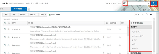 当用户完成搜索操作后,系统对搜索结果进行发件人、文件夹、日期、优先级、和是否包含附件等进行自动分类管理。便于用户进行快速定位查找都邮件。
