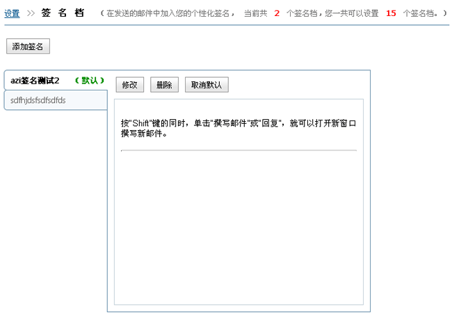 - 2) 在“添加”签名编辑框内填入签名的提示(如按私人、商务用邮件分类签名),在“签名内容”框内填入签名的内容,如您的署名、公司名称、电话等;并可设为默认签名;